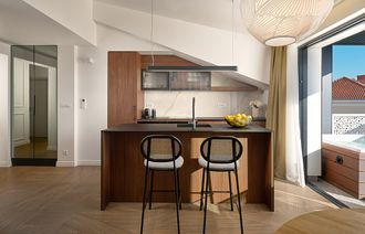 The penthouse features two bedrooms, two bathrooms, a baggage storage room, a fully equipped kitchen, a kitchen island with bar stools, a dining room and a living room with a fireplace.