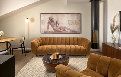 The penthouse features two bedrooms, two bathrooms, a baggage storage room, a fully equipped kitchen, a kitchen island with bar stools, a dining room and a living room with a fireplace.